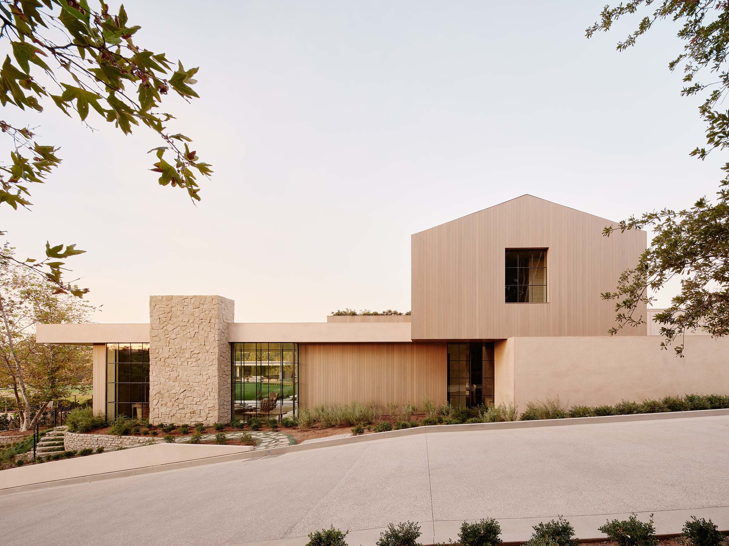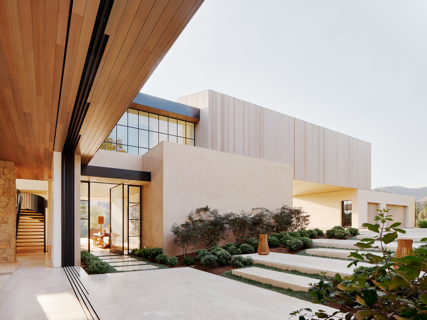 Los arquitectos han denominado el estilo de la casa “Mandeville Modern”, y la simplicidad y naturalidad de los materiales claramente se refieren a un vernáculo de granja moderna. En el último piso, los tres dormitorios y dos oficinas están revestidos con revestimiento de cedro rojo occidental de tono rojizo. En los pisos inferiores y en las áreas exteriores, el suelo de travertino conecta y tranquiliza.