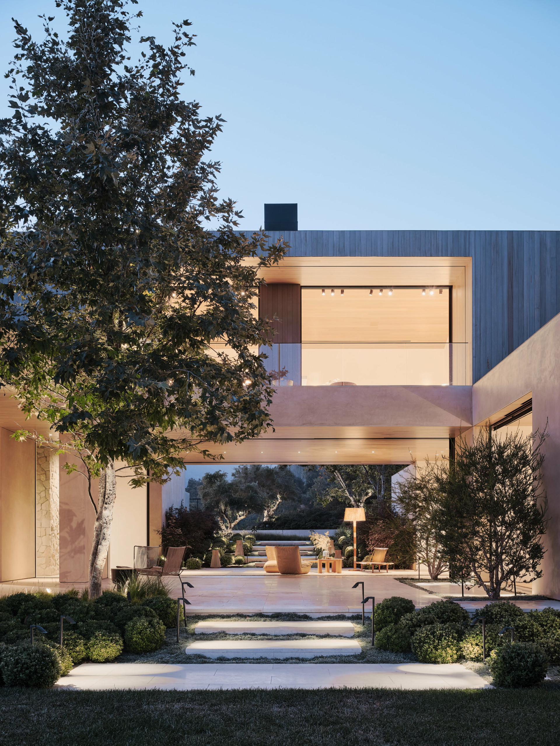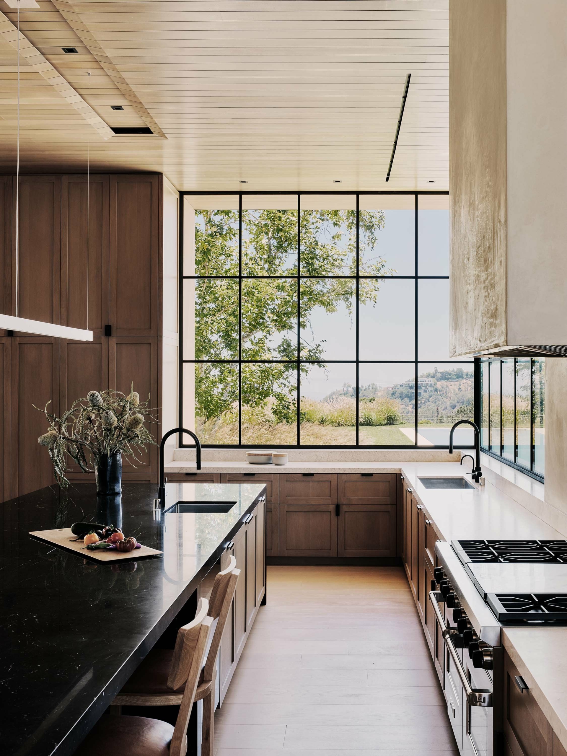 Aprovechar al máximo el amplio terreno de cuatro acres y las vistas envidiables hacia las playas de Santa Mónica fueron los principales objetivos de los arquitectos, diseñadores de interiores y paisajistas cuando fueron contratados para crear una residencia moderna en Mandeville Canyon.