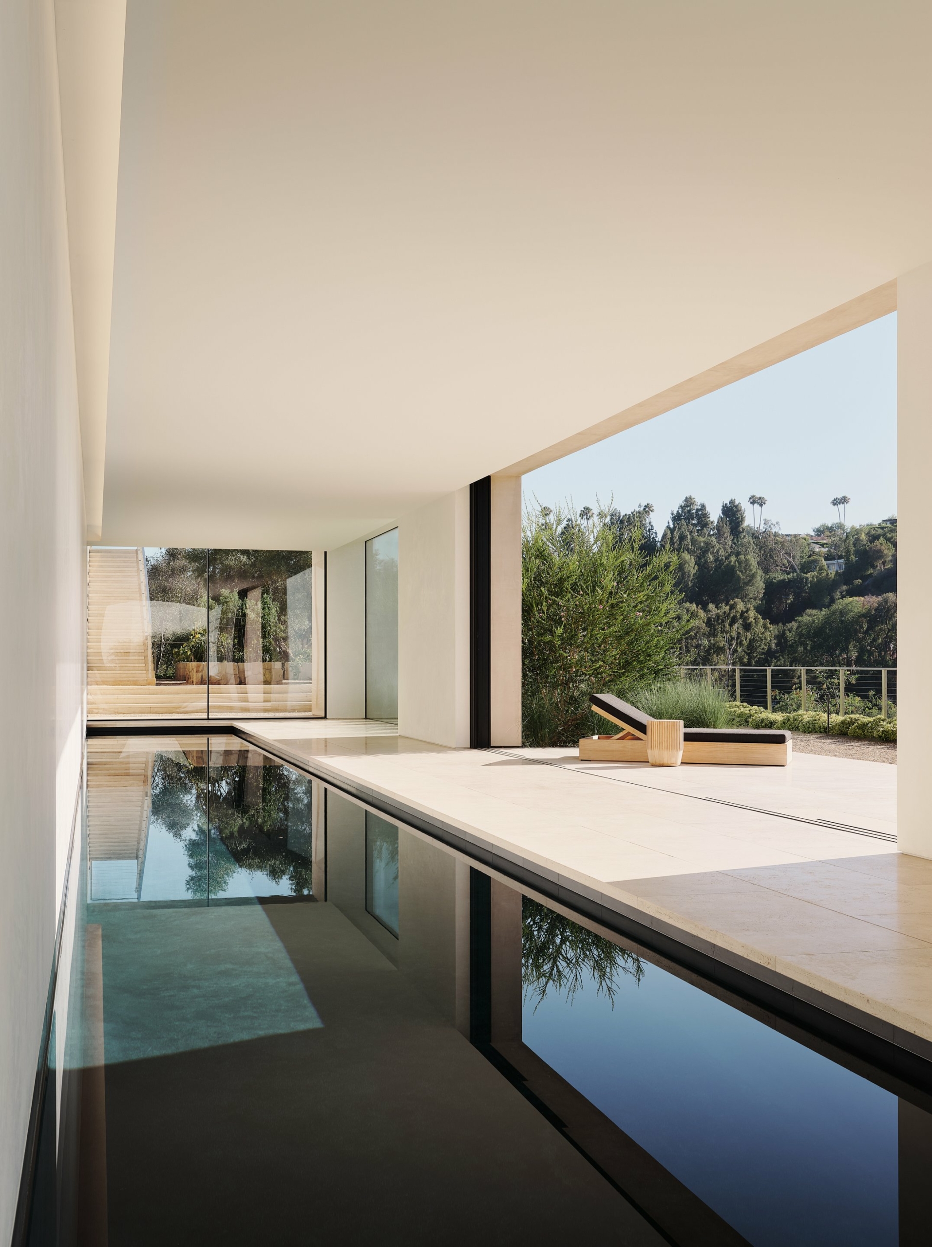 En el nivel más bajo, incluso la piscina cubierta, las habitaciones de invitados y una suite para el cuidador tienen vistas hacia el cañón de Mandeville.